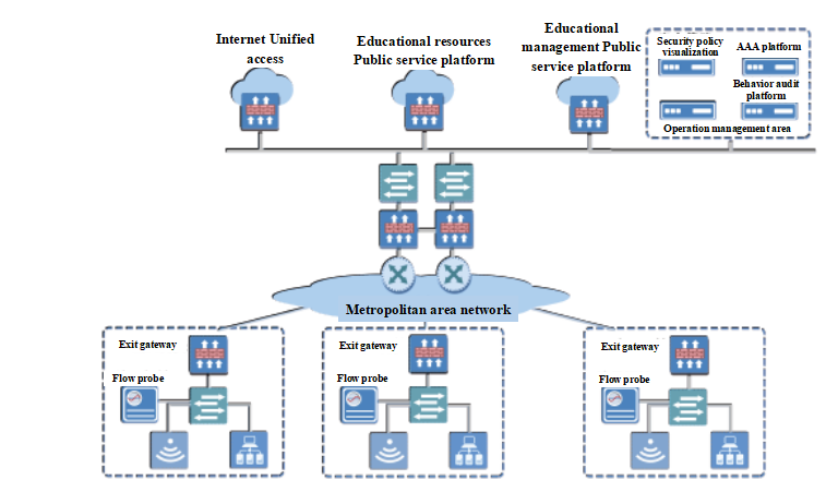 Exit gateway and flow probe products are deployed at exits of access institutions, security policy visualization platform and behavior audit platform at data center.